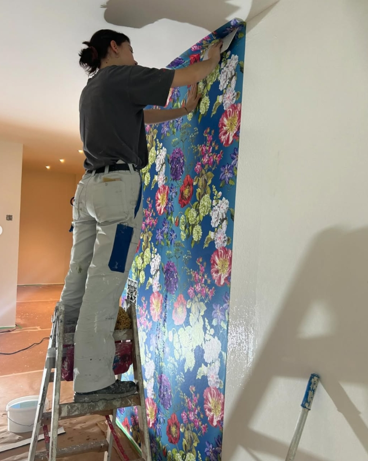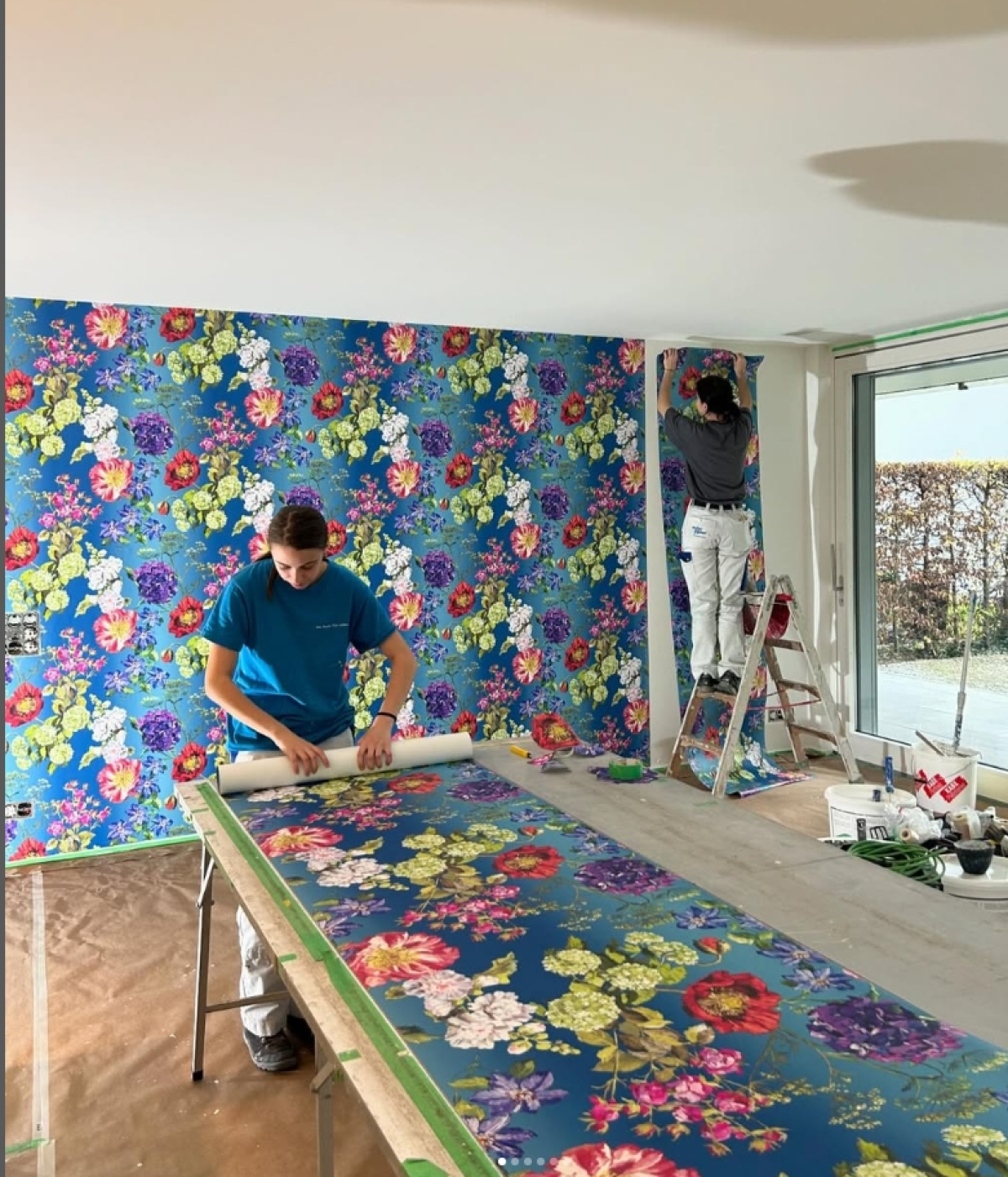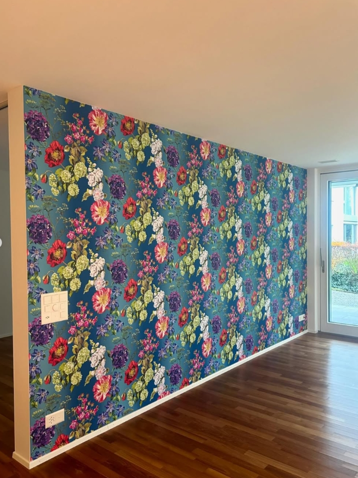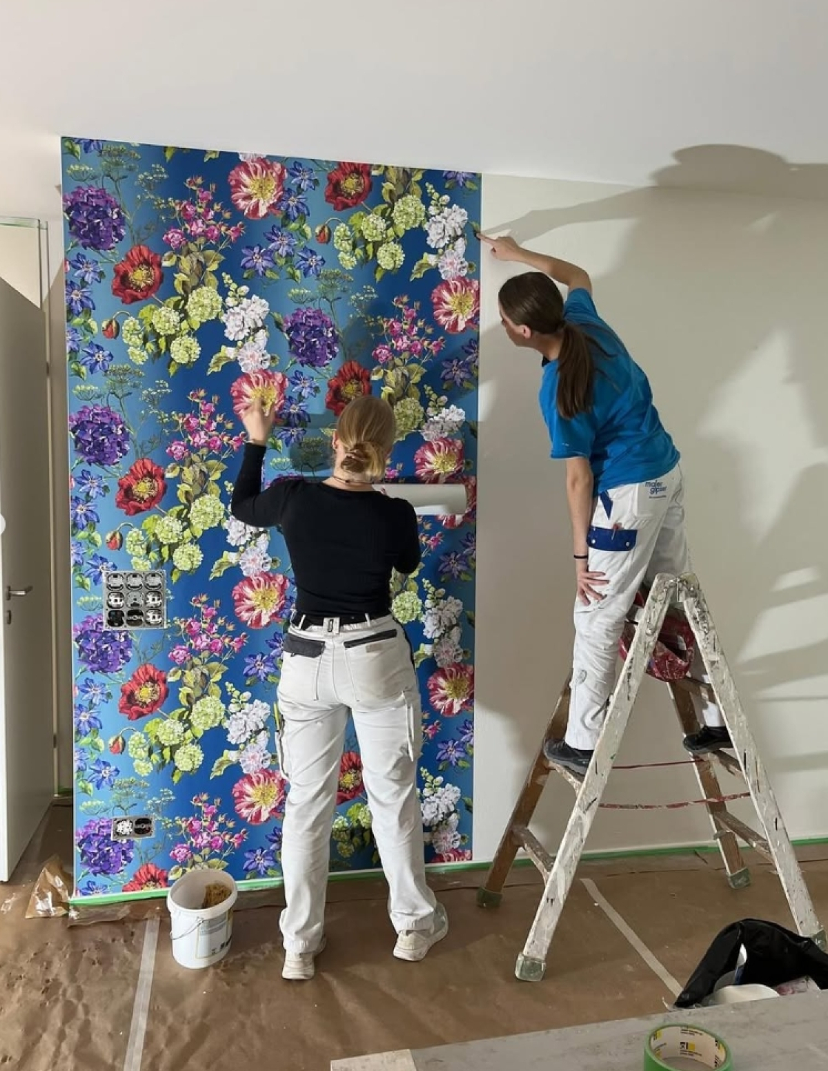 Unsere Baustellenleiterin Ariane Hilpertshauser hatte die Gelegenheit, gemeinsam mit den Lehrlingen Ayleen Gemperle und Sherin Heimann eine wunderschöne Tapezierarbeit mit einem floralen Muster zu applizieren. Die drei arbeiteten Hand in Hand, um die Wände mit dem lebendigen Design zu verschönern und eine einladende Atmosphäre zu schaffen. Durch ihre kreative Zusammenarbeit entstand ein beeindruckendes Ergebnis, das die Räume mit Farbe und Leben füllte.
