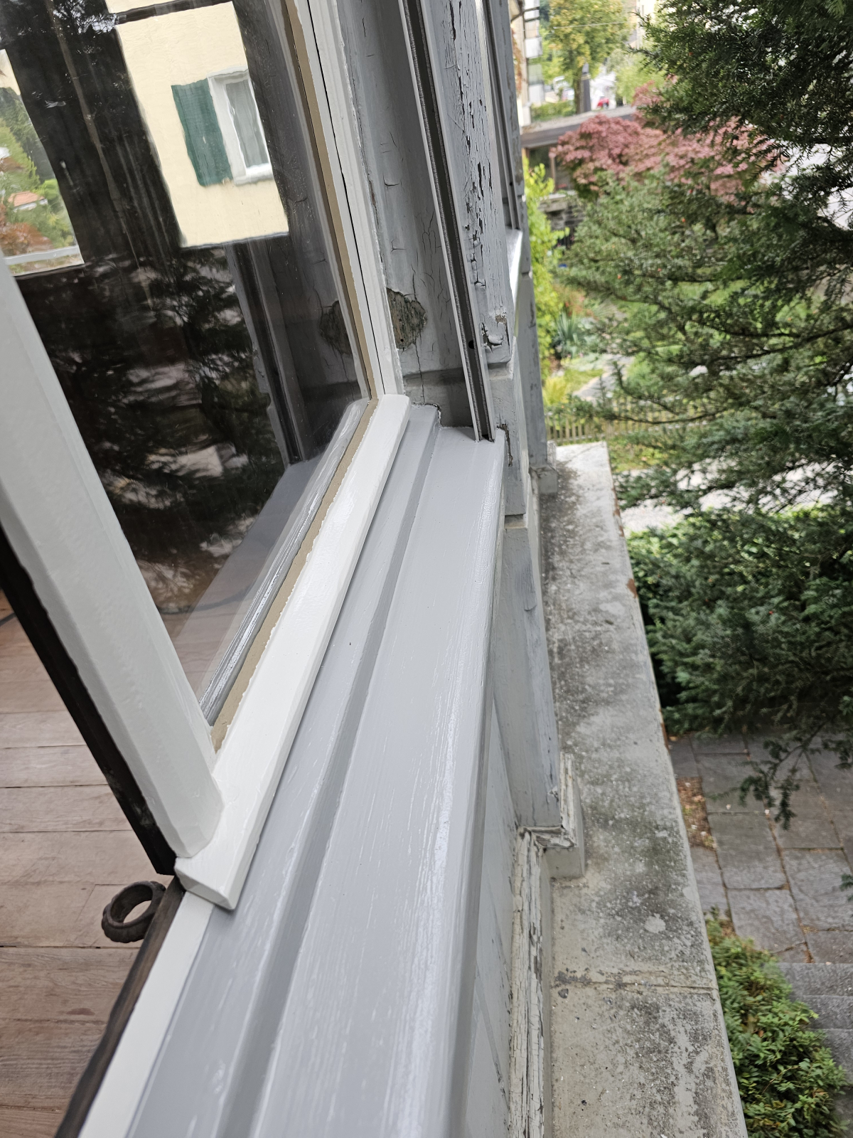 Wir hatten die Gelegenheit, die Fenster und Fenstersimsen eines historischen Hauses zu renovieren. Das Holz wurde sorgfältig bis zur gesunden Substanz abgeschliffen und ist nun durch die neue Farbe wieder geschützt. Die Bauleitung übernahm Markus Baumann, der uns während des gesamten Projekts unterstützte.