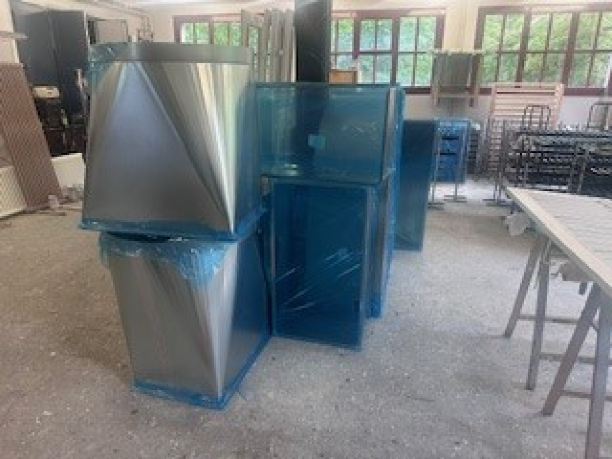 Unser Vorarbeiter und Spritzlackierer, Thomas Scherrer, liess sich auch davon nicht aus der Ruhe bringen und baute verrschiedenes Hilfsgerüste, um auch die übverdimensionalen Metallteile zu spritzen, in der selben Farbe, wie wir bereits 2020 die gesamte Eventhalle gespritzt haben.